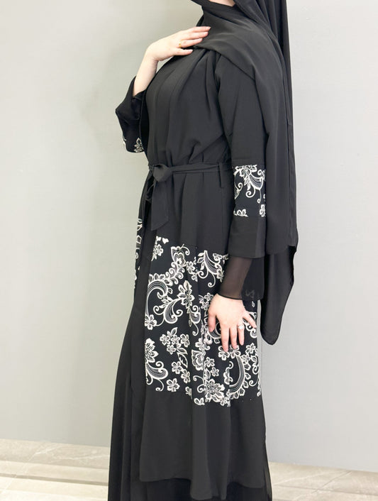 White Floral Abaya - Black