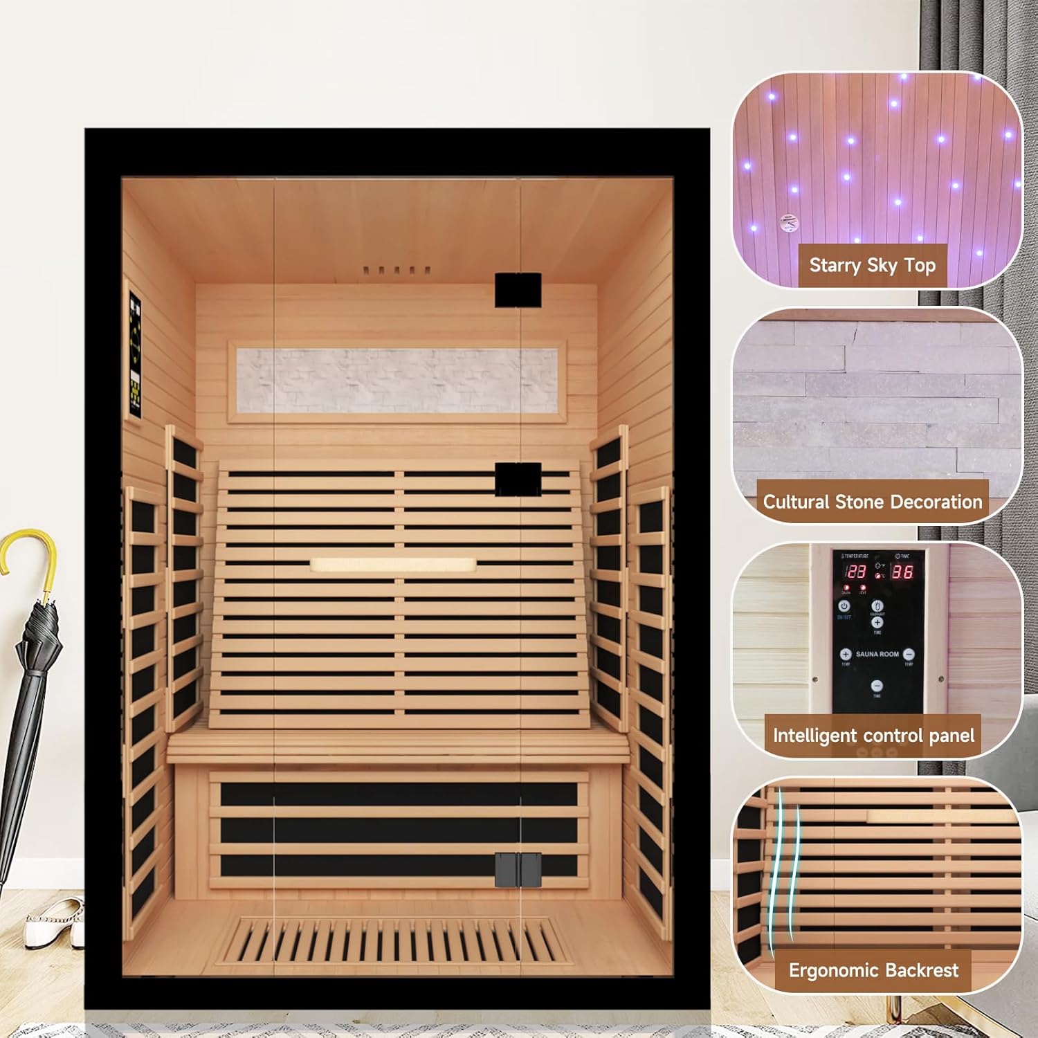 Chromotherapy & Oxygen Bar: Enjoy 7-color LED chromotherapy lighting, known to enhance mood and relaxation. The built-in oxygen bar further boosts vitality and breathing during your sauna session.