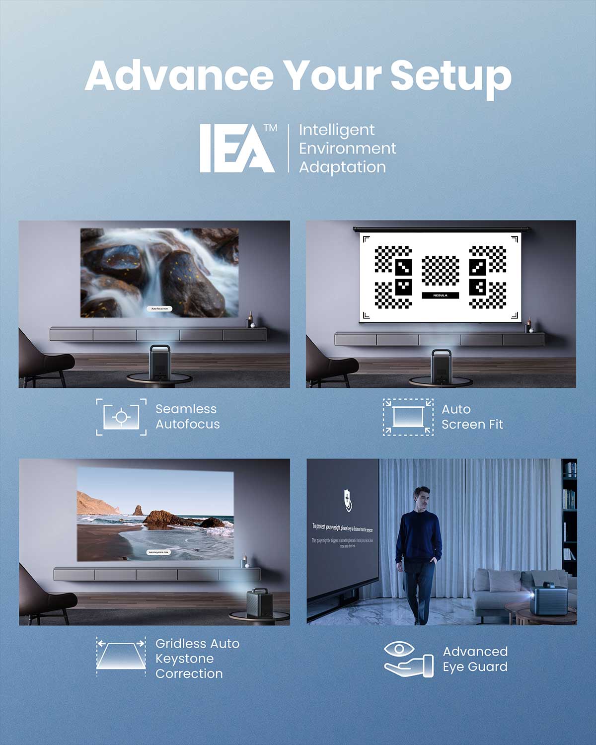 Instant Setup, Zero Hassle With Intelligent Environment Adaptation (IEA) technology, Cosmos Laser 4K analyzes your space and automatically adjusts the screen size and position for a perfect fit in just seconds.