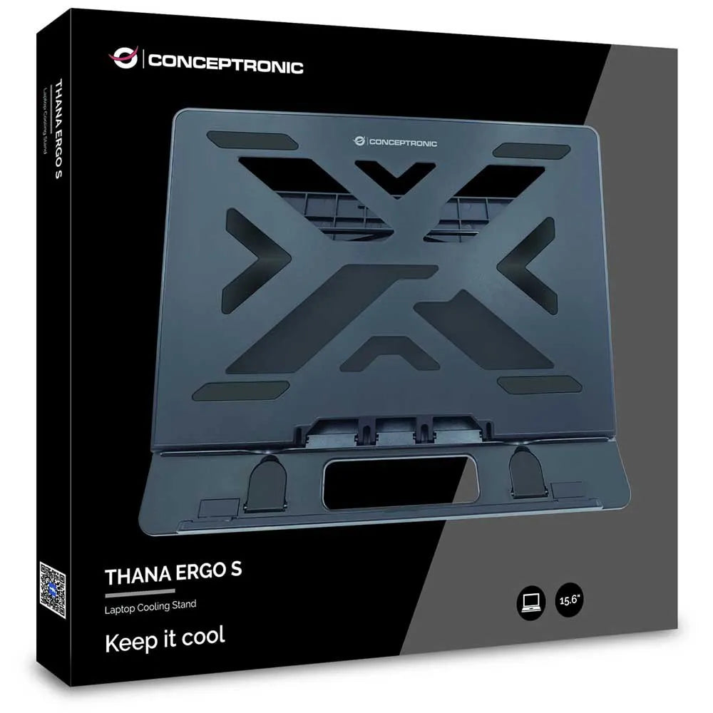 Enhance your laptop's performance and comfort with the Conceptronic THANA03B ERGO Laptop Cooling Stand. Designed to support laptops up to 15.6 inches, this sleek black stand offers both functionality and style.