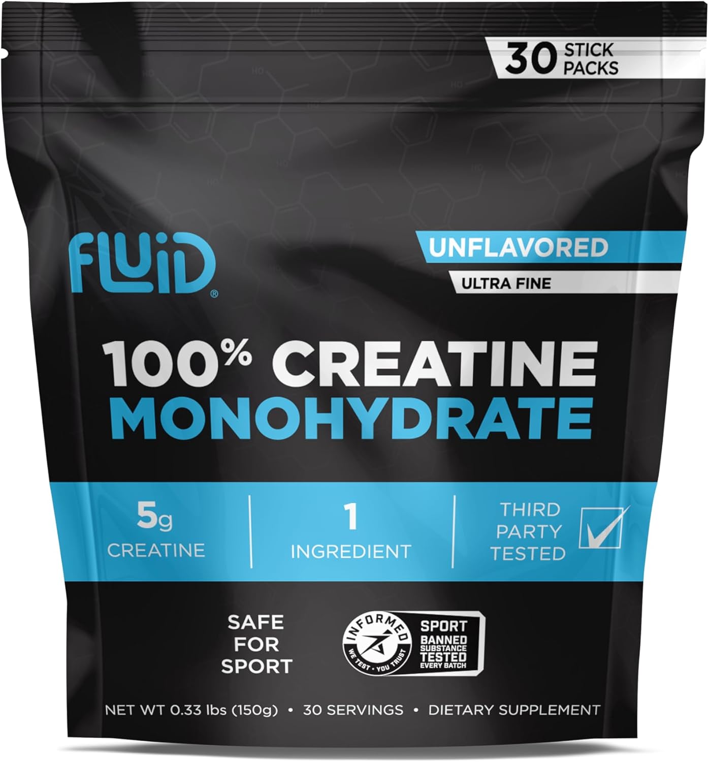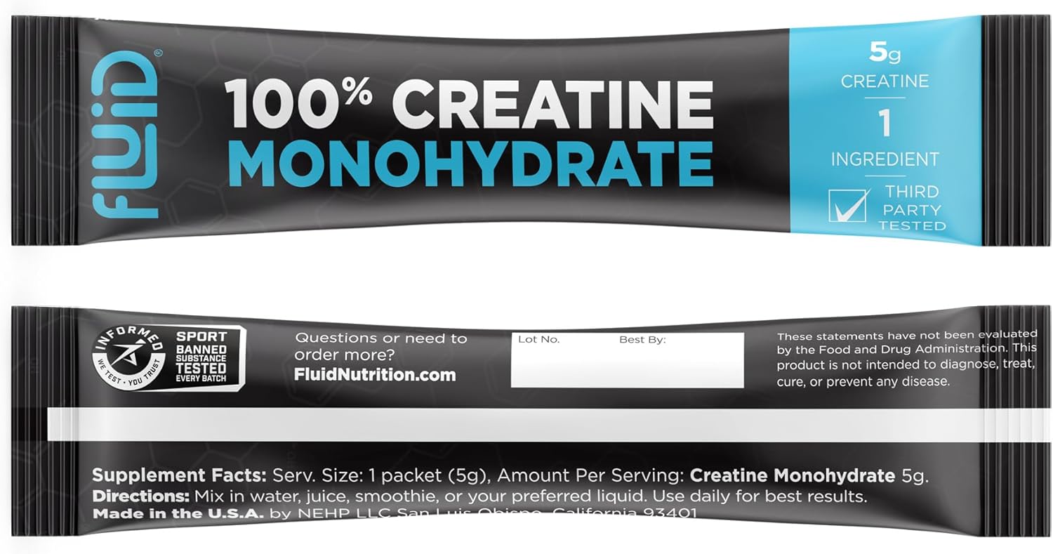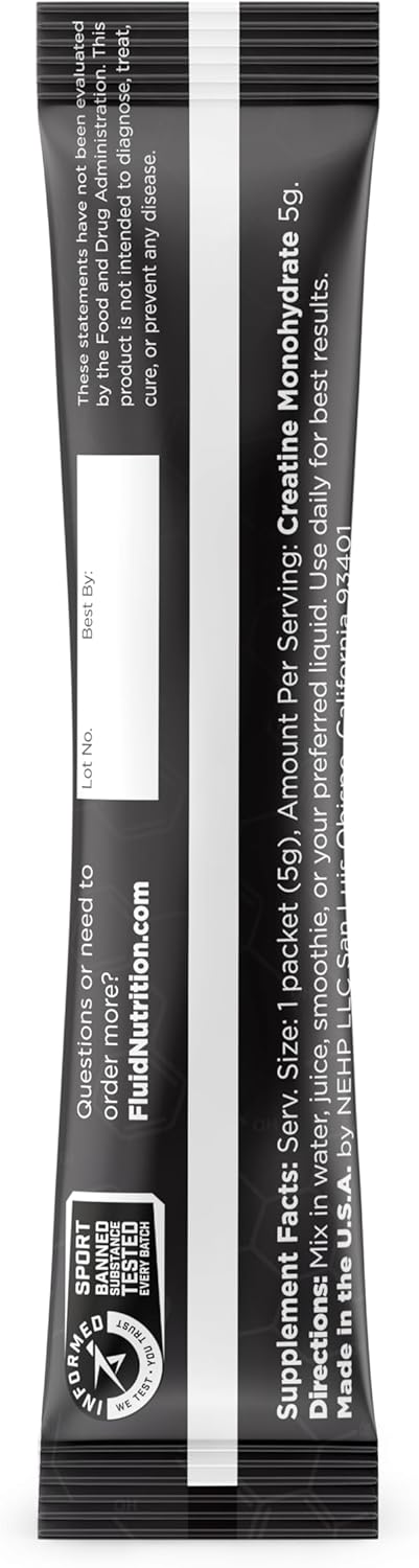Achieve peak performance with Fluid Ultra-Fine Micronized Creatine Monohydrate a premium, single-ingredient supplement trusted by athletes and certified for purity and safety. Each 5g single-serving sachet delivers 100% pure, ultra-fine creatine monohydrate that dissolves quickly and absorbs efficiently to help fuel muscle strength, power output, and recovery.