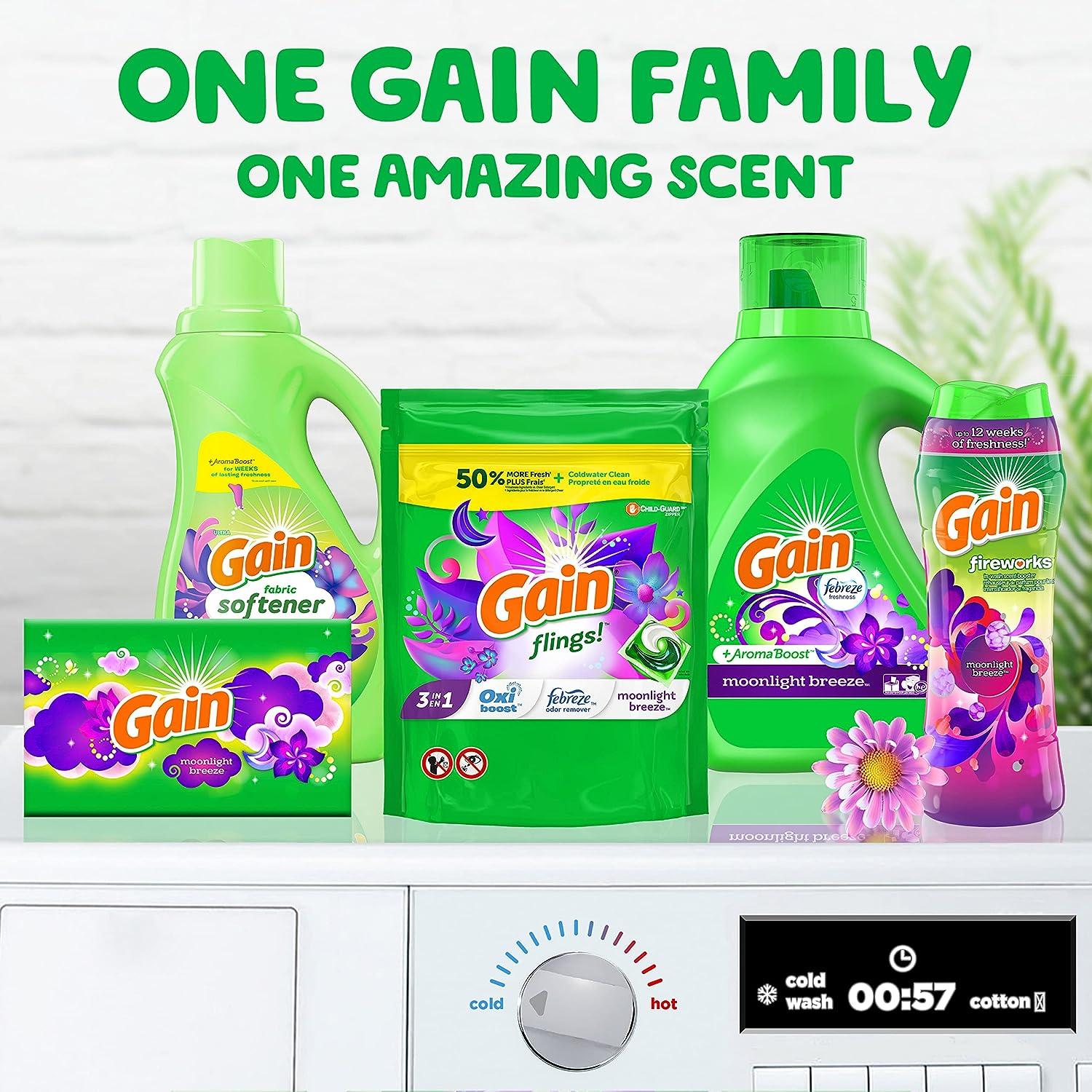 Gain flings! laundry detergent pacs are packed with 50% more scent than Gain liquid laundry detergent. Armed with the stain-fighting power of Oxi and Febreze, they give you nothing but great, clean, amazing-smelling laundry. Use with any laundry set-up, because Gain flings! Pacs dissolve in both hot and cold water and are HE compatible. The light, delightful scent of Moonlight Breeze flings will make your nose feel like it’s in paradise.