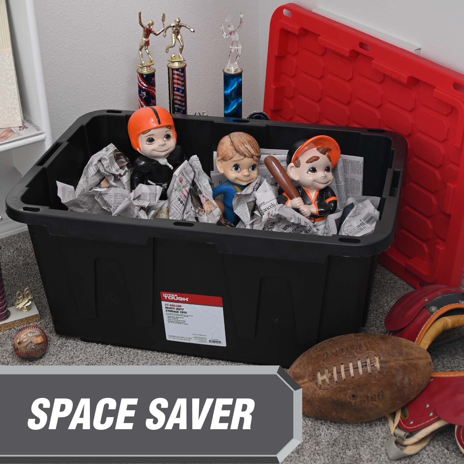 Organize clutter and hide unused items with the Hyper Tough 27 Gallon Snap-Lid Plastic Storage Tote Box with a black base and red lid. Made of durable plastic (polypropylene), the tough storage tote allows you to hide away things you don’t want to be seen while the red snap-lid adds a pop of color to your space and makes it easy to find. The 2-point snap-lid ensures your items are safely secure during storage or transport. The specially molded lids allow you to stack multiple totes on top to prevent toppling while maximize storage space. Protect your valuables by utilizing the 6 tie-down holes made for zip-ties and padlocks. The long lasting Hyper Tough tote works great in basements, closets, pantries, sheds, barns, and attics. This tote is great for organizing household products, gardening supplies, pet treats and supplies, shoes, clothing, seasonal gear like boots, sporting equipment such as golf balls, tennis balls, or drill cones, and many other items.
