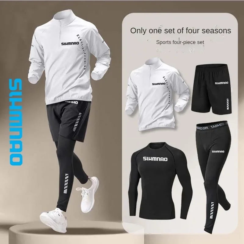 4-in-1 Fitness Set: Short-sleeve shirt, shorts, leggings, and zip-up hoodie.
