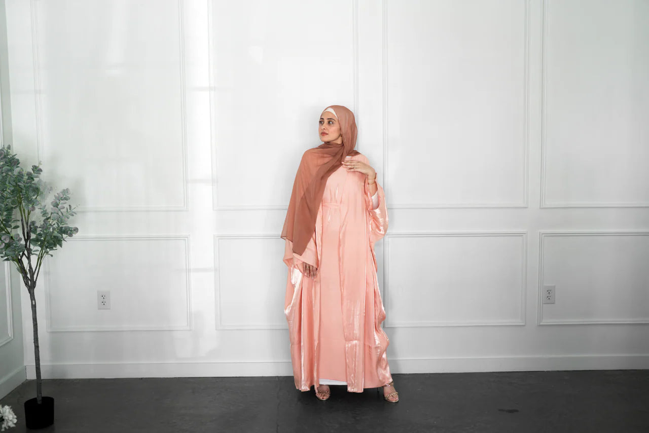 Pair this pink metallic abaya with gold or nude heels and soft, minimal accessories for a chic, romantic look. Layer it over a neutral slip dress to enhance its delicate beauty.