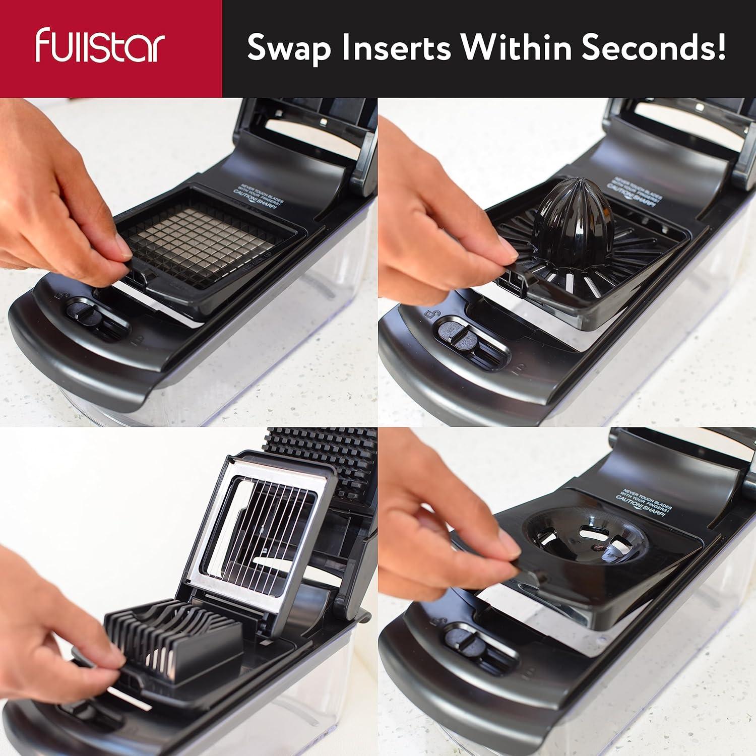 Not a master of cooking? It doesn't matter. Let the Fullstar veggie cutter help you with your dinner! With 4 different types of blades, 3 interchangeable inserts, 3 cleaning brushes, and 1 blade case, this 11 piece set ensures you get that perfect cut every time you use it. Banish time-consuming meal preps with our handy vegetable slicer!